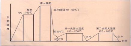 420鋼材淬回火狀態(tài)下使用(硬度48-54HRC),為滿足長期工作或制件數(shù)量達100萬件以上壽命要求,更為適宜的使用方法應做淬火低溫回火處理。淬火是先加熱至1000-1050℃保溫一定 時間(按30分/25mm計算),然后淬入油中冷卻至50-100℃并立即回火處理,以防止開裂。在200℃回火(至少4小 時)硬度可達到48HRC以上,