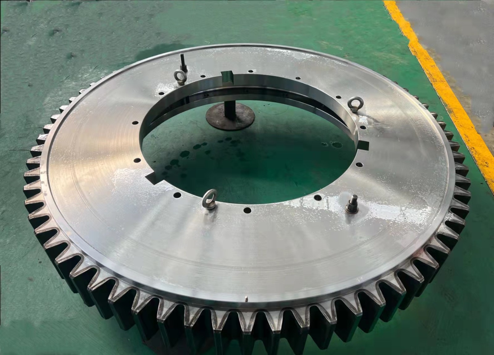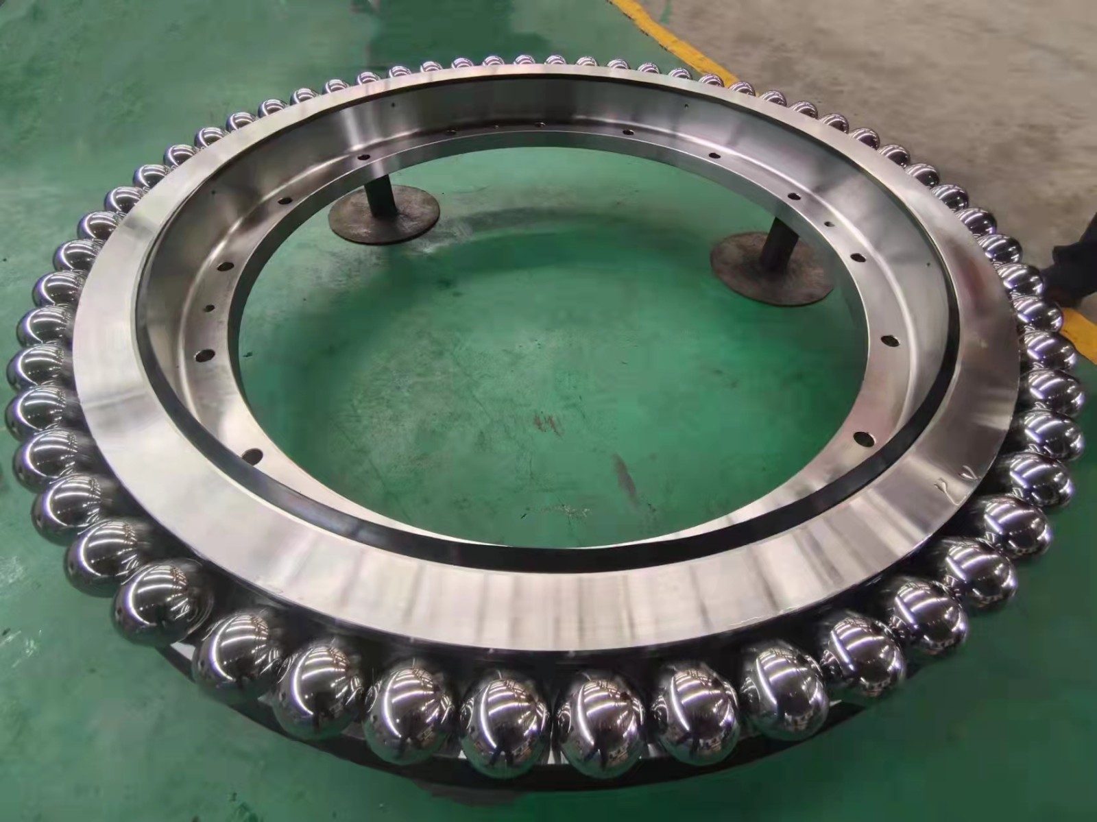 2022年3月,我公司為某客戶自主研制的特種設(shè)備用推力角接觸球轉(zhuǎn)盤軸承LYPF-2190,通過客戶的現(xiàn)場驗收。該軸承創(chuàng)造了多個公司記錄,鋼球直徑***大(鋼球直徑Φ100),套圈壁厚***大(外套壁厚526mm),***大齒輪模數(shù)(模數(shù)30),工序***多(端面槽、內(nèi)徑缺口和大模數(shù)齒面淬火都是***次加工),是我公司***次加工轉(zhuǎn)盤軸承種類少見的單排推力角接觸球轉(zhuǎn)盤軸承。